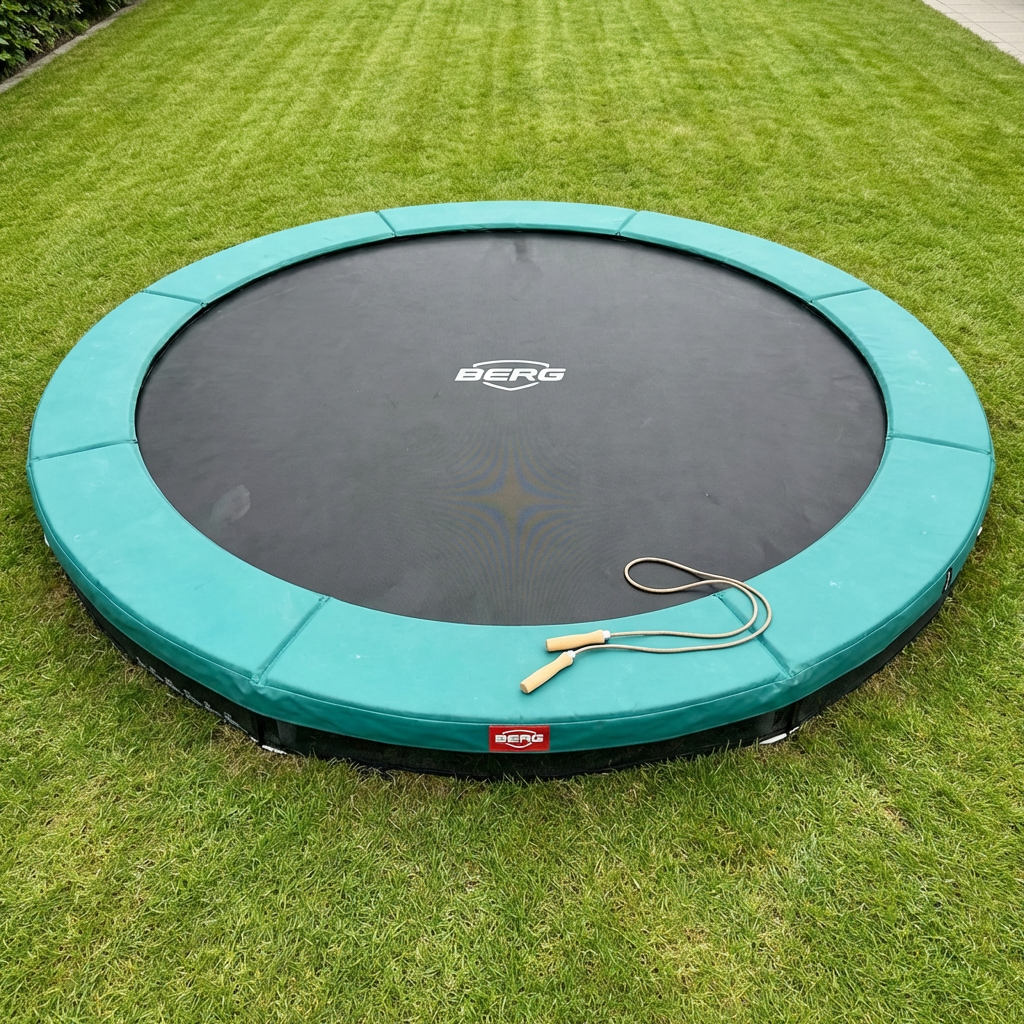 En FlatGround trampolin er helt nedgravet og ligger i niveau med græsset. Det giver et stilrent look og meget nem adgang, men kræver mere præcist gravearbejde og korrekt installation.